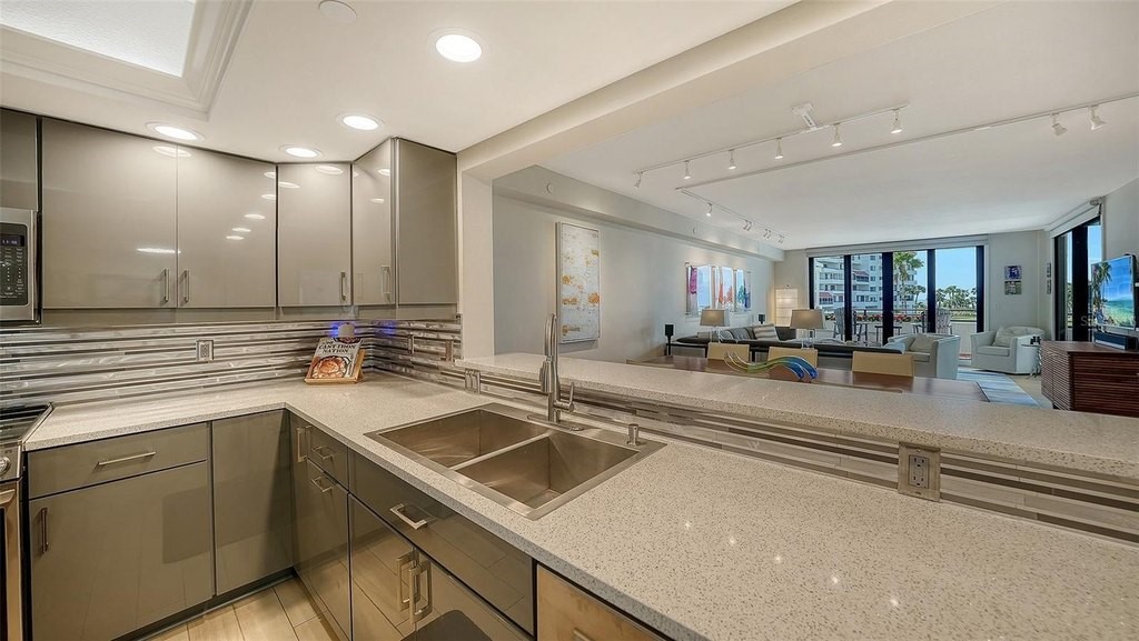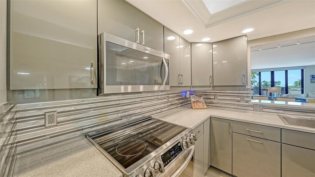 Welcome to luxury Gulf-front living at The Players Club. This sophisticated three-bedroom, three-bathroom end-unit condominium offers unobstructed Gulf views from two spacious covered balconies. Its thoughtfully designed floor plan maximizes vistas and natural light across an expansive interior. The residence has undergone a comprehensive renovation, featuring a modern kitchen outfitted with custom cabinetry, quartz countertops, a center island adorned with stainless steel and espresso wood base cabinets, as well as a contemporary tile backsplash and high-end appliances. Additional upgrades include new porcelain plank flooring, freshly painted walls, updated baseboards, designer window treatments, and enhanced lighting throughout. All bathrooms have been beautifully updated with new cabinetry, countertops, tile, and premium fixtures. The great room layout with two master suites, each providing water views and private access to the extended terrace. Impact-resistant windows and sliding doors have been installed to comply with the latest building codes. For convenience, the unit includes both an assigned under-building parking space and an enclosed garage, accompanied by an external storage room. The Players Club demonstrates a commitment to excellence with recent engineering and reserve studies, ensuring ongoing community stability and maintenance. Elevator systems have been modernized and certified. The association maintains fully funded reserves for long-term reliability. Spanning 11 pristine Gulf-front acres on Longboat Key, this private community offers unparalleled amenities. Life at The Players Club is defined by luxury and leisure. Residents enjoy a newly renovated clubhouse equipped with a state-of-the-art fitness center, library and meeting room, catering kitchen, various gathering spaces, four Har-Tru tennis courts with pickleball capabilities, a 70-foot heated saltwater pool and spa, putting green, fire pits, outdoor grills, lushly landscaped grounds, deeded beach access, and the assurance of 24/7 gated security and on-site management. Players Club is ideally situated near the new St. Regis Resort, with optional membership available at The Longboat Key Club & Resort, granting privileged access to golf, dining, tennis, and the only deep-water marina on the island. Beyond the community, residents benefit from proximity to local conveniences, including Publix, CVS. and boutiques within two minutes, and the upscale shops and restaurants of renowned St. Armands Circle just five minutes away. The famed cultural amenities, many fine dining options, and shopping in downtown Sarasota is just 15 minutes from The Players Club.